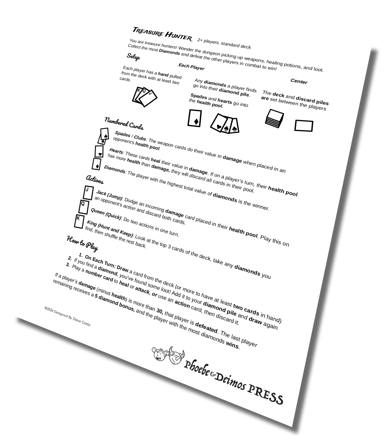 Players wandering through deep and dark dungeons looking for loot. Unfortunately, other Treasure Hunters have the same intentions! Use spears and clubs found in the catacombs to defend yourself while finding as many diamonds as you can to win!